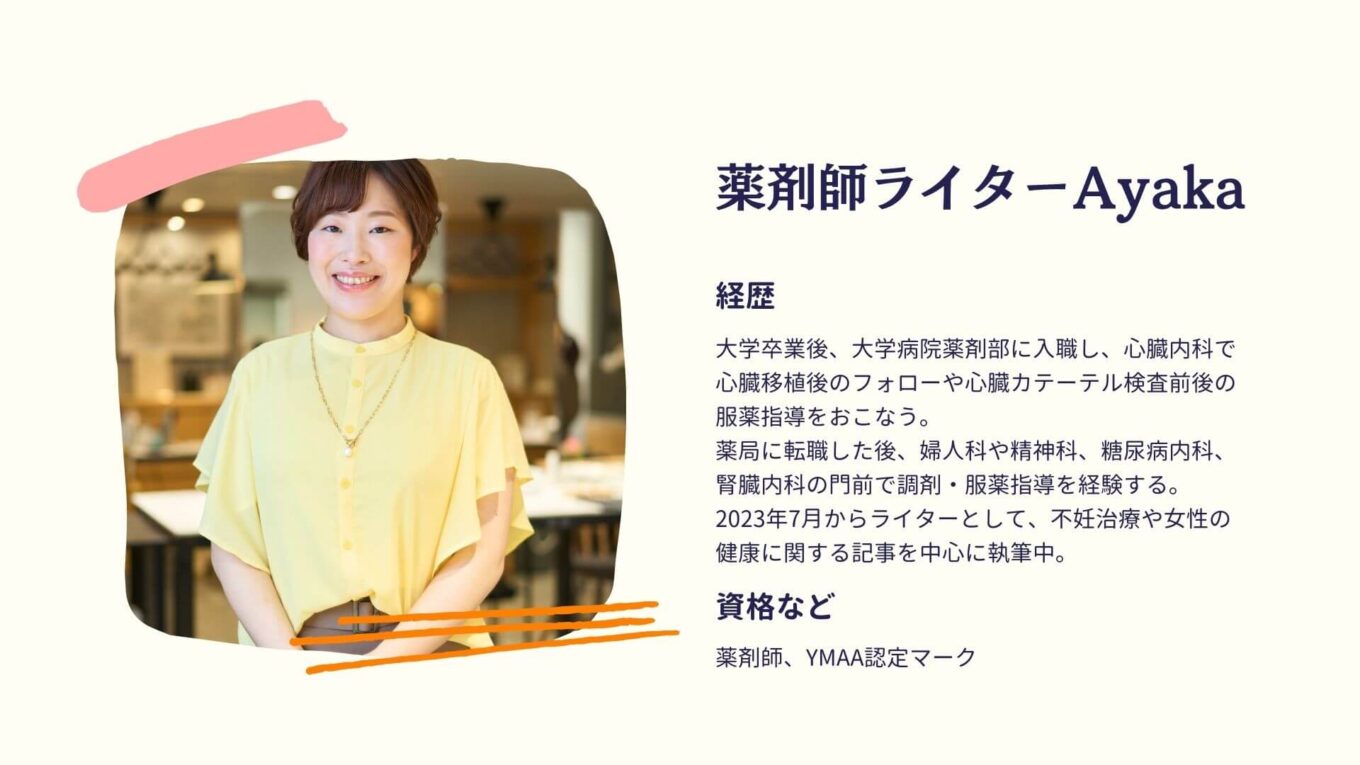 Ayaka薬剤師ライターProfile大学病院薬剤部に入職し、心臓内科で心臓移植後のフォローや心臓疾患の患者の服薬指導をおこなう。薬局に転職後、婦人科や精神科、糖尿病内科、腎臓内科の門前で服薬指導を経験する。現在は女性の健康や不妊治療、漢方に関する執筆を中心としてライター活動中。